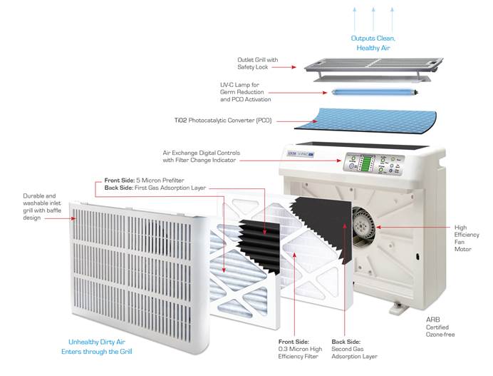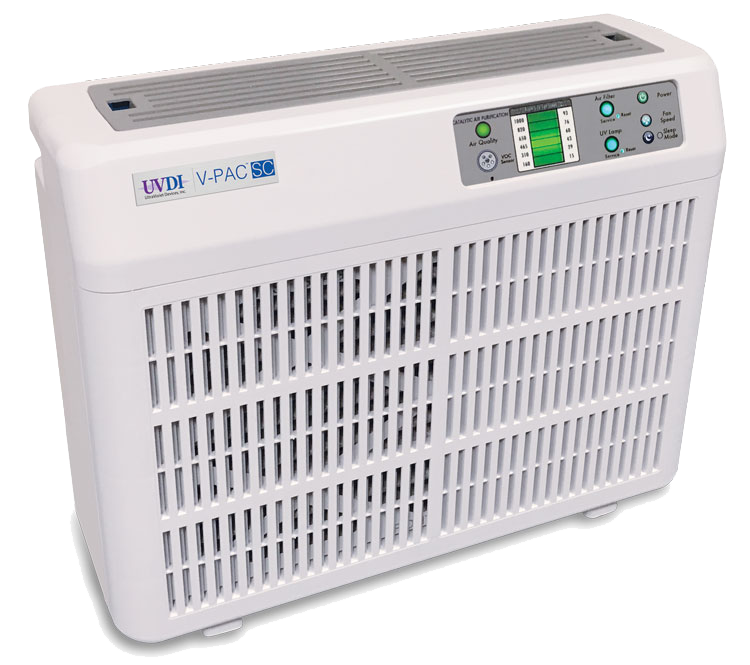 El V-PAC ™ SC aborda las 4 fuentes de aire interior contaminación (partículas, gases, aerosoles y olores). La clave para el sistema es la oxidación foto catalítica que destruye virus, bacterias y compuestos orgánicos volátiles (COV)