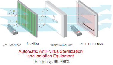 Este dispositivo que puede instalarse encima de la cama, disponible para configuración móvil o fija, filtrando el aire con filtros pre y ULPA y la luz UVC con 254 nm y eliminando el virus al instante.