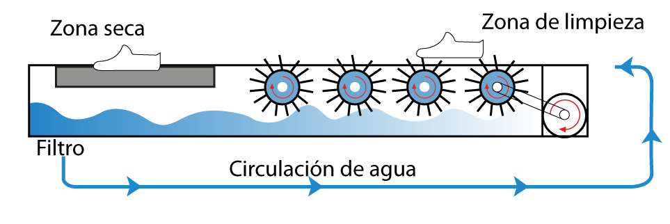 Cepillo de alambre DuPont importado de Estados Unidos, de 2 mm con un cuerpo de acero inoxidable 304, sistema de circulación de agua, el cepillo limpia la suela desde arriba a través de un movimiento circular, para eliminar la suciedad, previniendo la contaminación del polvo.
